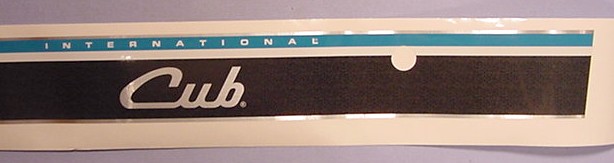 Decal shown on hood and fuel tank LH side. This decal was used on International Cub with squared style front hood with flat grille serial# 248125 and above.