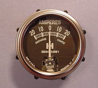 background, white letters and pointer, IH logo, shows part# 354473-R91. For use with Cub or Cub Lo-Boy with 6 volt or 12 volt electrical systems. This gauge is the part number referenced in Parts Manuals TC-37B (5-2-1951) and TC-37C (8-29-1952). |