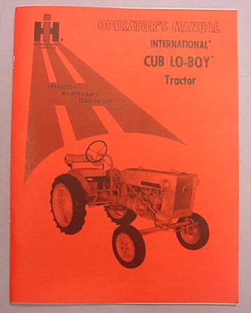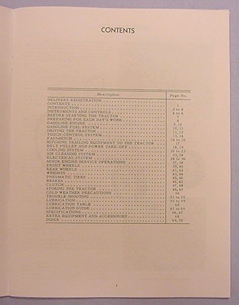 printed in the U.S.A. This is a reprint manual with a date "8-1-63-1B" on the back cover. Manual pages are stapled to form a booklet. For use with: This manual covers operation of the tractor, basic maintenance, specifications, and safety, includes electrical diagrams for 6 Volt tractors. |