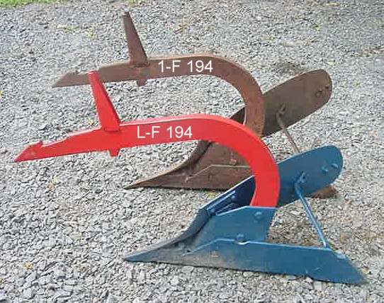 "Comparision between the L-F194 and 1-F194 Moldboard Plows" There is a definite overall size and weight difference between the L-F194 plow for the Farmall Cub tractor and the 1-F194 plow for the Farmall 100 series tractor. The beam part number for the L-F194 is "520260R21CUB" and the beam part number for the 1-F194 is "520849R11" The L-F194 shown is a 12 inch plow The 1-F194 shown is a 16 inch plow |